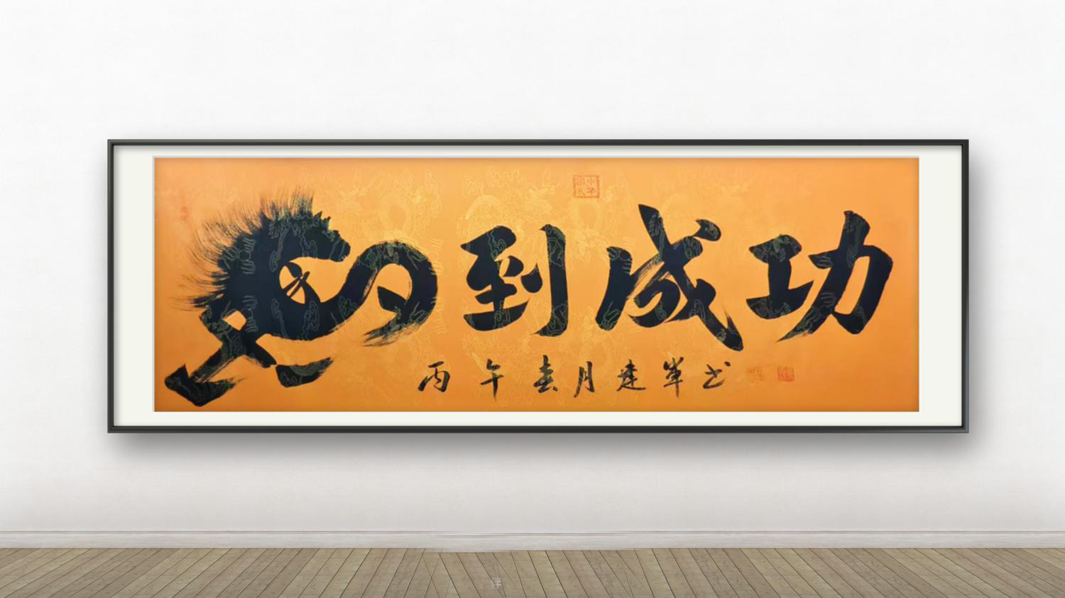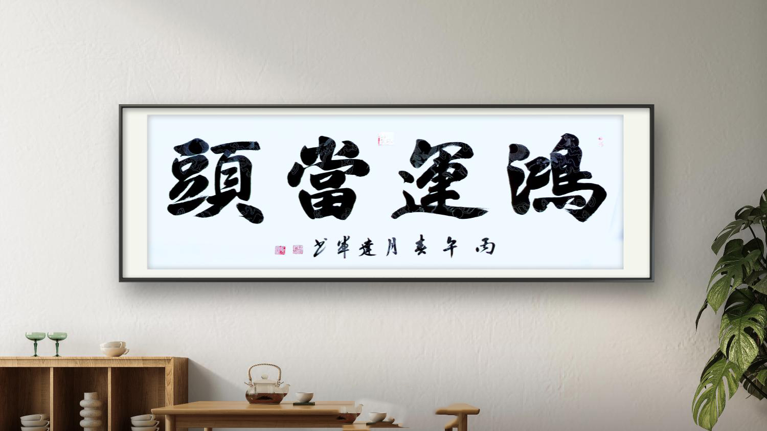 其书法作品,无论是榜书大字如“拼搏”“福”“鸿运当头”,还是行草小品,皆能展现出驾驭笔墨的深厚功力。笔画间既有北碑的雄强骨力,又不失帖学的灵动气韵;结体严谨而不失洒脱,墨色浓淡相宜,于法度中见性情,于传统中显新意。正如其作品“马到成功”,将“马”字以写意笔法融入字形,形神兼备,气势磅礴,体现了他“书为心画”的艺术追求。